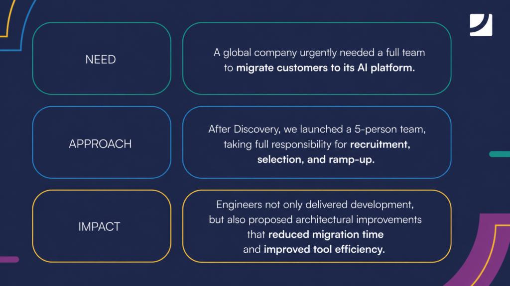 After Discovery, we move on to selecting candidates for the team — and at this stage, we rely on our proven approach as well. We start with our internal pool of vetted specialists. A Java recruiter speaks with Java developers, a frontend expert with frontend engineers. This peer-to-peer dialogue allows us to quickly identify gaps in real, hands-on competence.