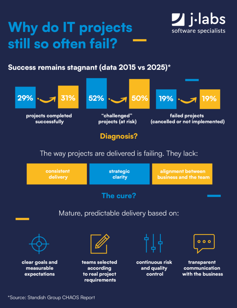 At j‑labs, we have been supporting organizations facing these challenges for years. We take responsibility for project delivery — including defining the team composition, ways of working, and the level of engineers’ involvement — so that the project can start smoothly from the very first sprint.